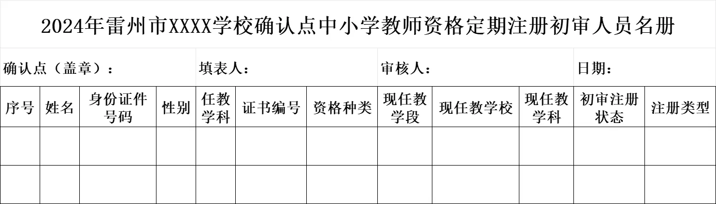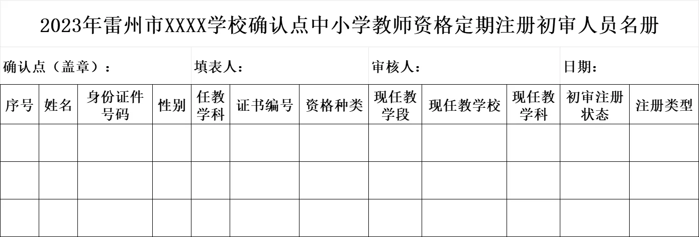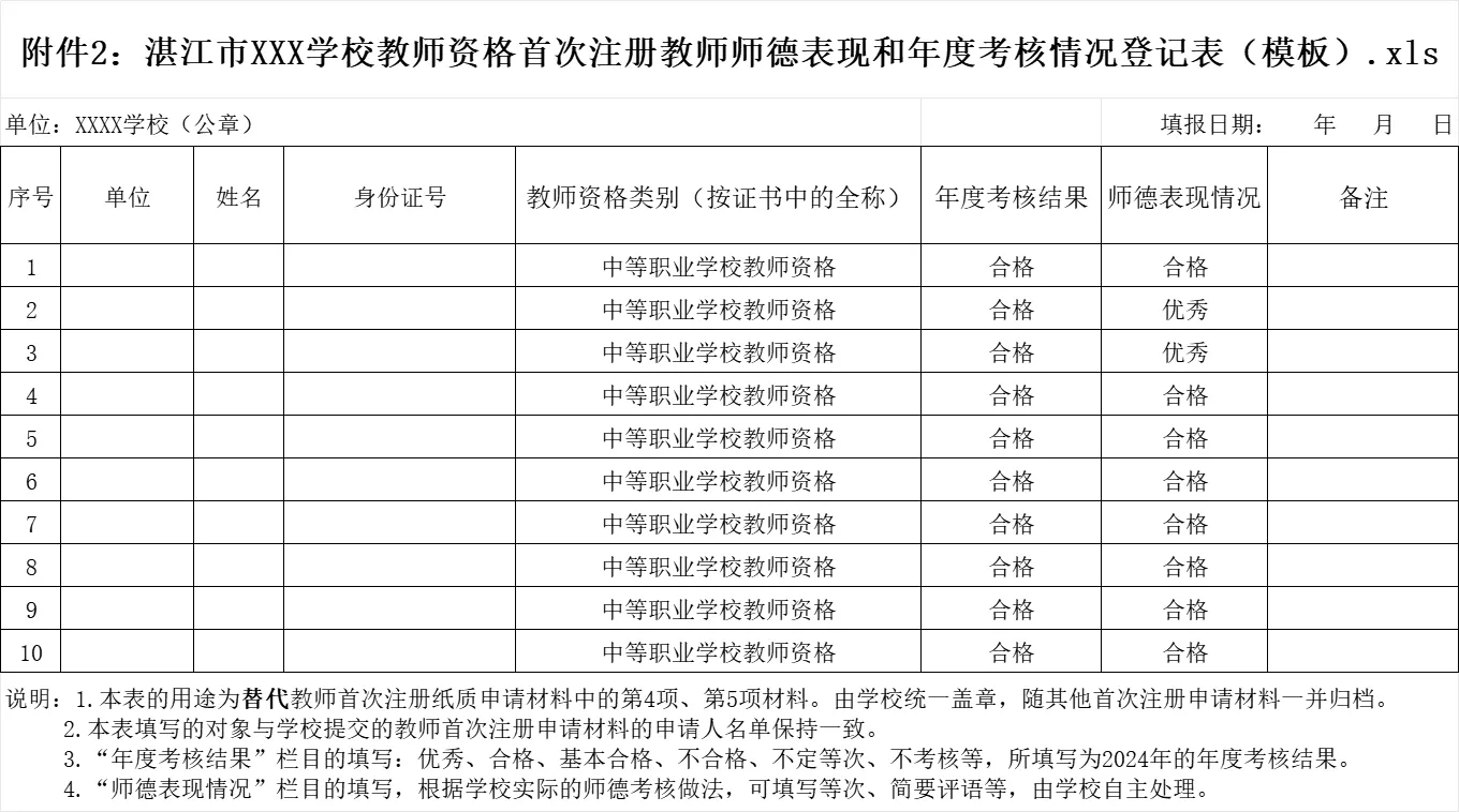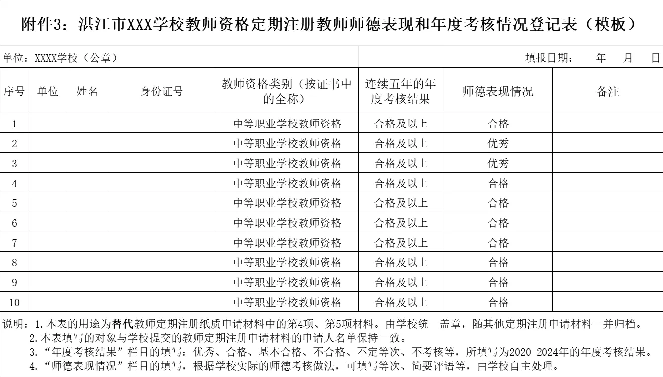 用《湛江市XX学校教师资格定期注册教师师德表现和年度考核情况登记表》替代教师注册纸质申请材料中的第4项、第5项材料。以学校为单位打印一份(盖章),待注册完成后,随其他注册申请材料一并归档。